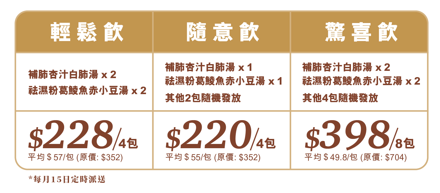 訂閱計劃: 每月發放2包補肺杏汁白肺湯及2包祛濕粉葛鯪魚赤小豆湯@$228 (平均$57/包)
